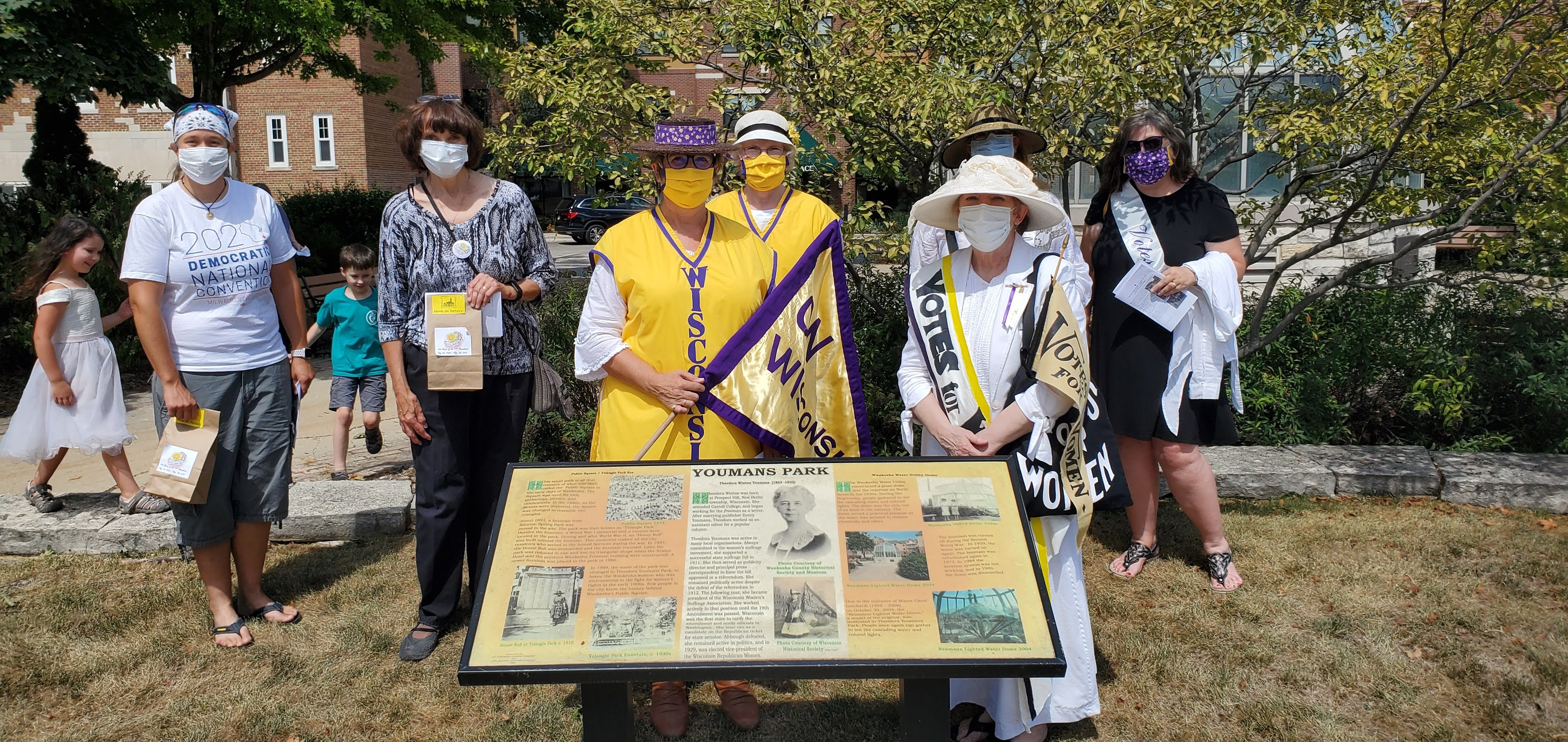 Several of us volunteers sewed purple/gold suffrage masks to give out along with suffrage craft items and information that day. Then ten of us walked the Waukesha Suffrage Trail that started at the Museum, where the first stop was the Theodora W. Youmans Park. Youmans of Waukesha played a significant role in the Wisconsin fight for suffrage.
