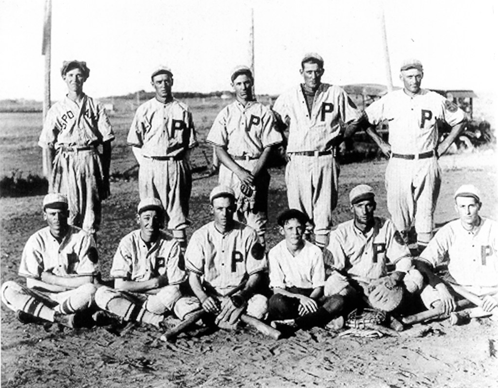 The history of “the old ball game” in Plankinton goes back 135 years. In the summer of 1882, just two years after the first building appeared on Main Street, a group of avid players formed a baseball team, as reported by the Yankton newspaper. In June of 1885, that same paper reported, “The dudes at Plankinton have organized a base ball club.” The following year, those dudes defeated the championship Kimball team, successfully terminating Kimball’s three-year winning streak in a hard-fought game. Victory may have been abetted by the Plankinton team’s vociferous complaining about the umpire’s bad calls that led to a replacement umpire taking the field after the fourth inning. In 1898, Plankinton produced its own championship team with three players named Mullen, two players named Teasdale, and others named Mabbot, Pease, Taubman, Closson, Cowell, and Gardner.